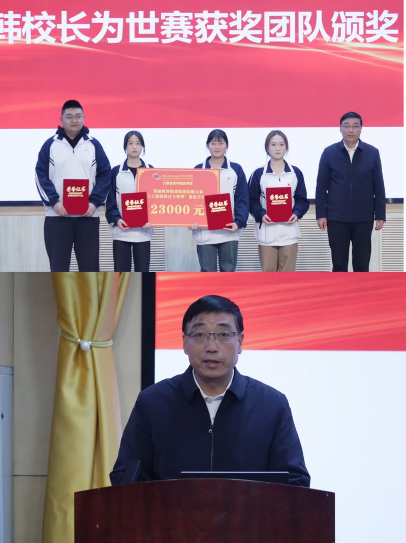 为表彰先进、树立榜样,激发学生学习热情,营造奋发向上的学风氛围,12月10日下午,工程管理与物流学院在高新校区博爱厅隆重召开2025年度技能大赛暨学风建设表彰大会。校长韩小卫、学院院长叶超、党总支书记张玉鹏、副院长杨小玉,学生处副处长黄阿岗、教务处副处长王涛,以及各科室负责人、全院师生共同参会。