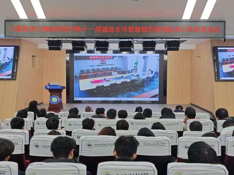 为积极推动2027届毕业生就业工作,搭建用人单位、学校与毕业生三方交流平台,12月16日下午16:00,管理学院在高新校区诚信厅举办中铁十一局城运公司智慧城市管理技术订单班宣讲会。中铁十一局城运公司党委书记诸葛祥菊、城市研究院副院长高占宽、人力资源部部长谢茜及部门骨干出席;校企合作处处长姜留涛,管理学院院长叶超、党总支书记张玉鹏、副院长杨小玉及各科室老师参加会议。2027届16个班级学生通过线上与线下相结合的方式参与。会议由杨小玉副院长主持。
